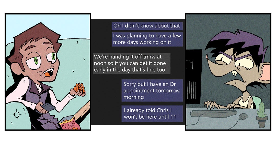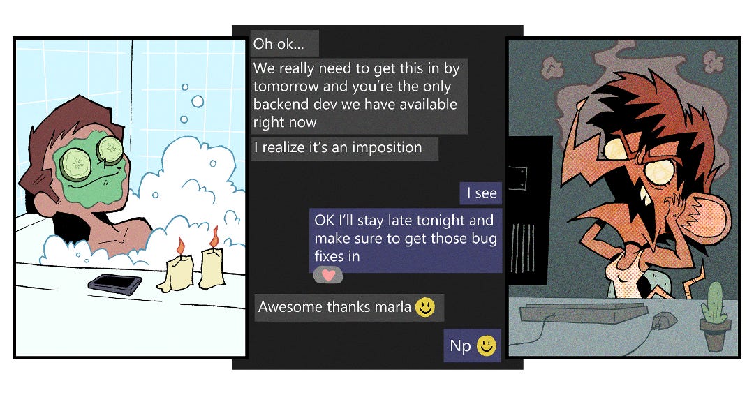 --Oh ok... We really need to get this in by tomorrow and you're the only backend dev we have available right now. I realize it's an imposition