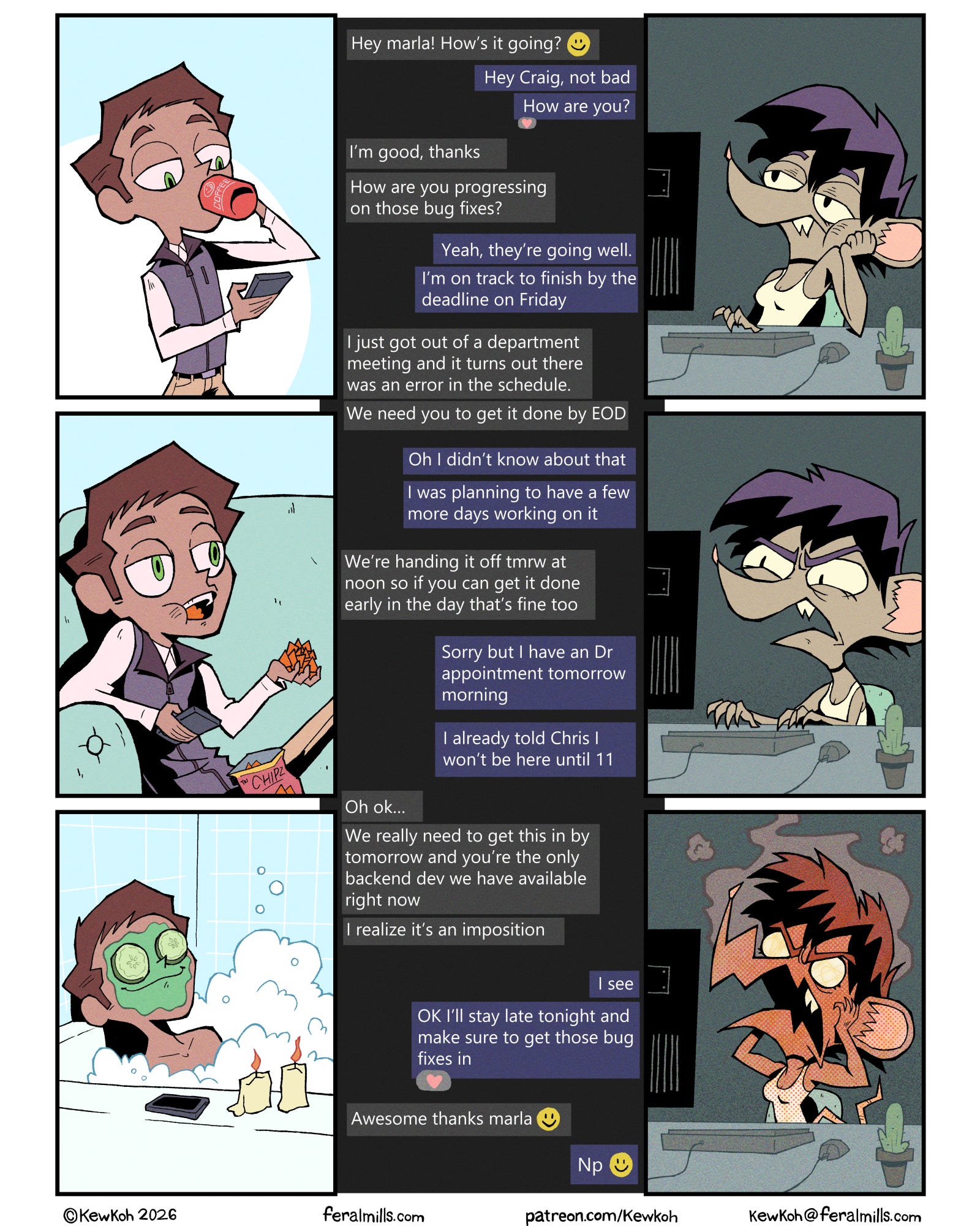 Craig smiles as he lies back in a bubble bath with a green facial mask smeared on his face and cucumber slices on his eyes. Marla rages, letting out a scream with smoke emanating from her head.
