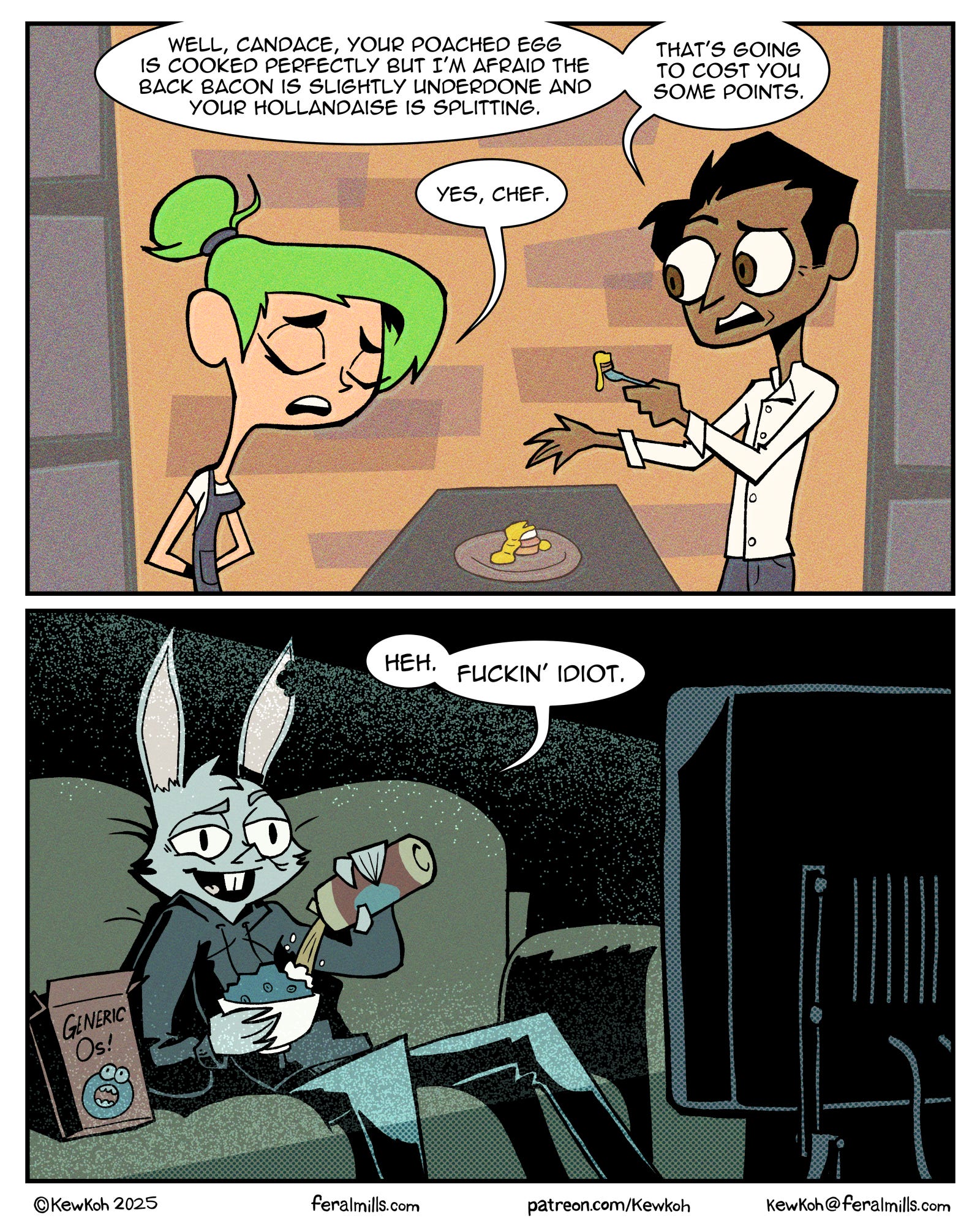 Chef: Well, Candace, your poached egg is cooked perfectly but I’m afraid the back bacon is slightly underdone and your hollandaise is splitting. That’s going to cost you some point.